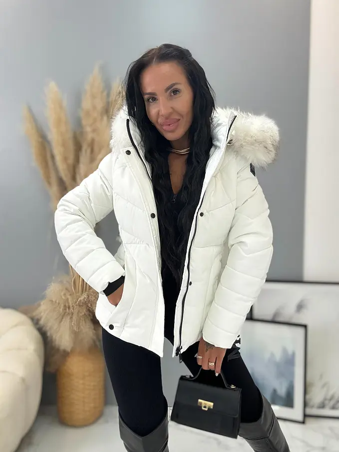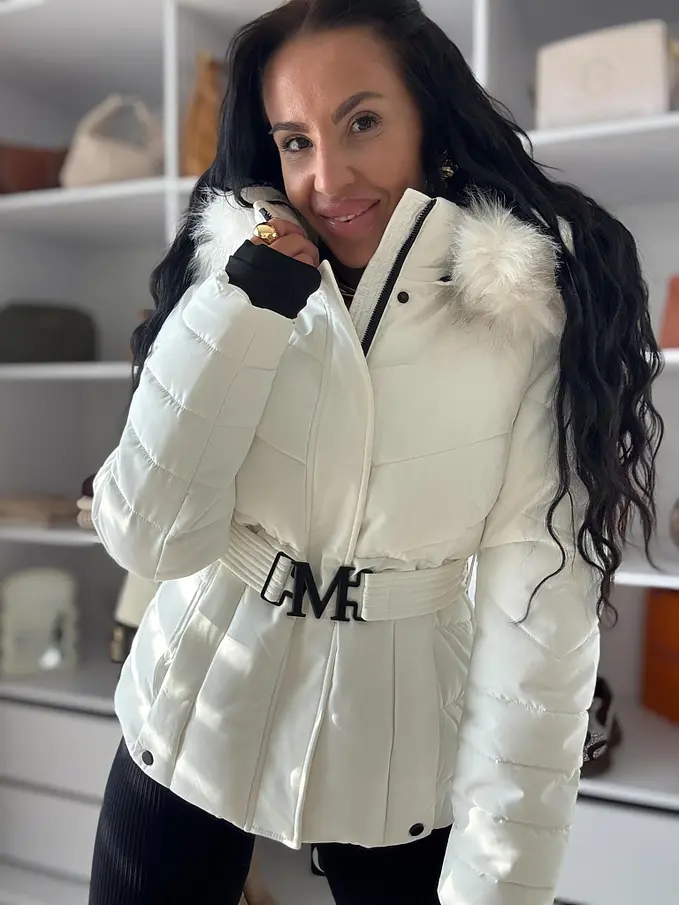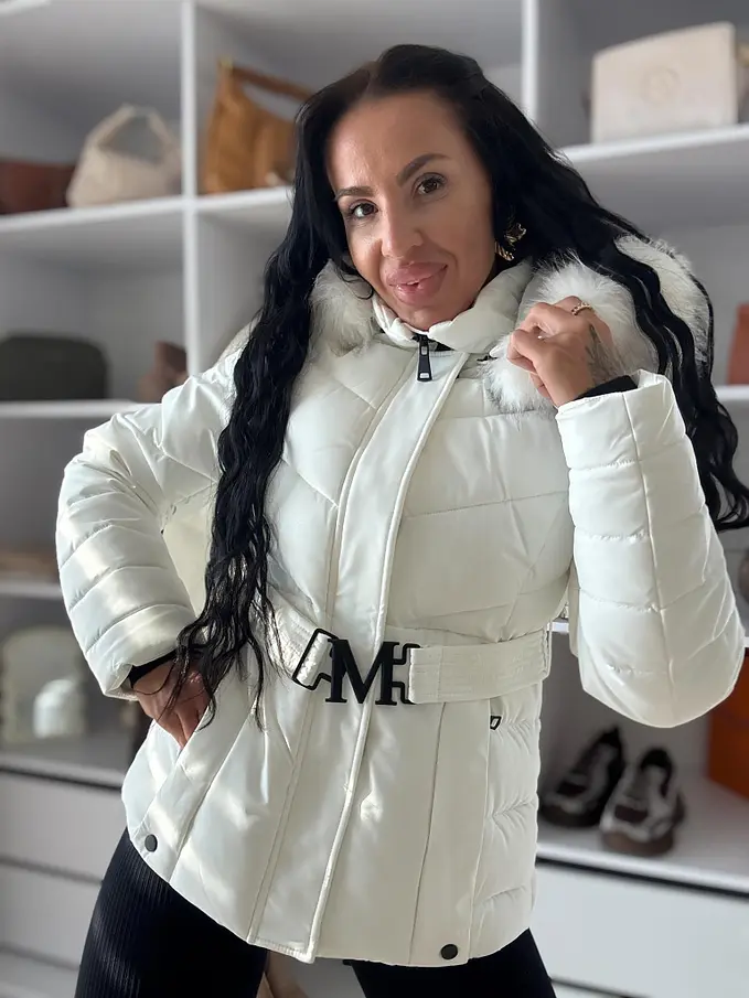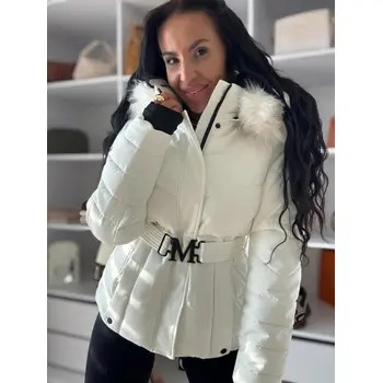 Kabát levehető szőrmés díszítéssel a kapucnin. Elején zsebekkel. Fekete színű cipzárral és díszítéssel. Levehető kapucnival és övvel.