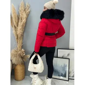 Kabát levehető szőrmés díszítéssel a galléron. Oldalsó zsebekkel. Fekete színű cipzárral és díszítéssel. Levehető kapucnival.