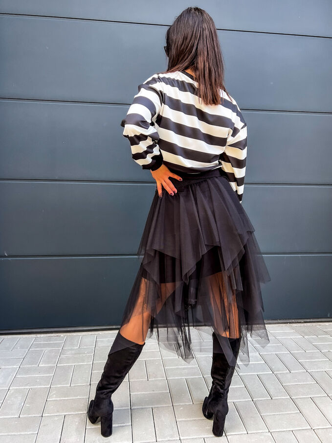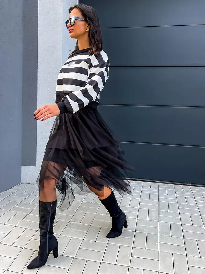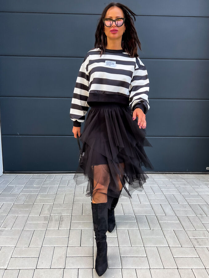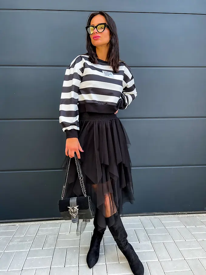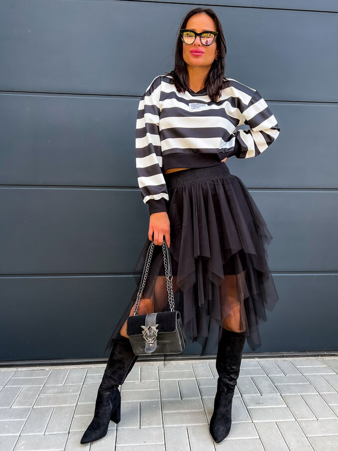 A barna hajú modell 158 cm magas és 50 kg. S méretű ruhákat visel.