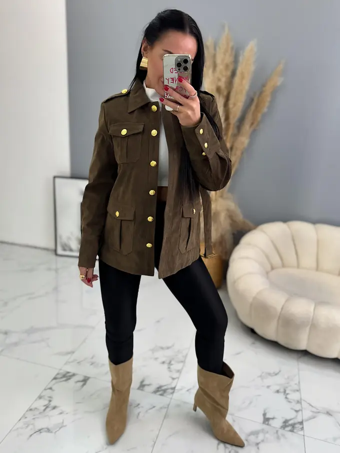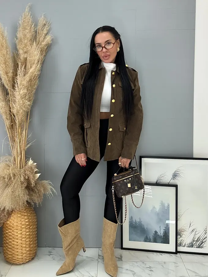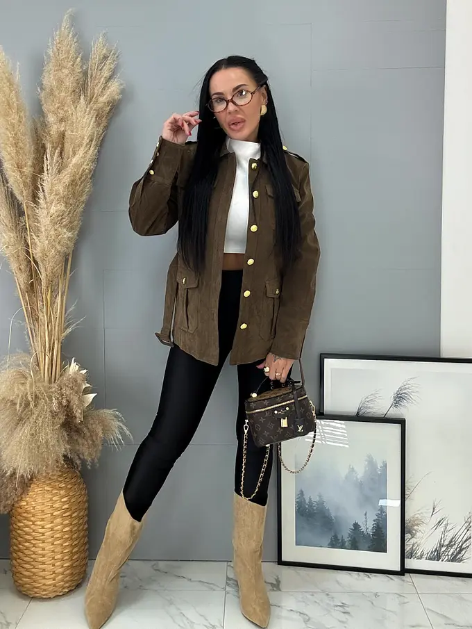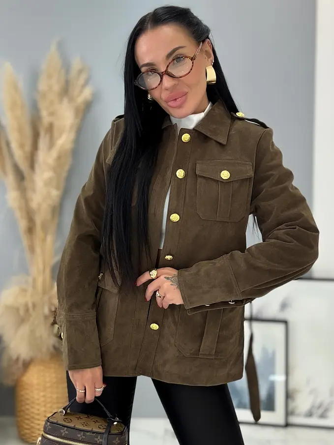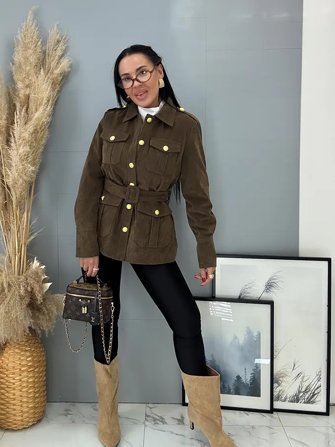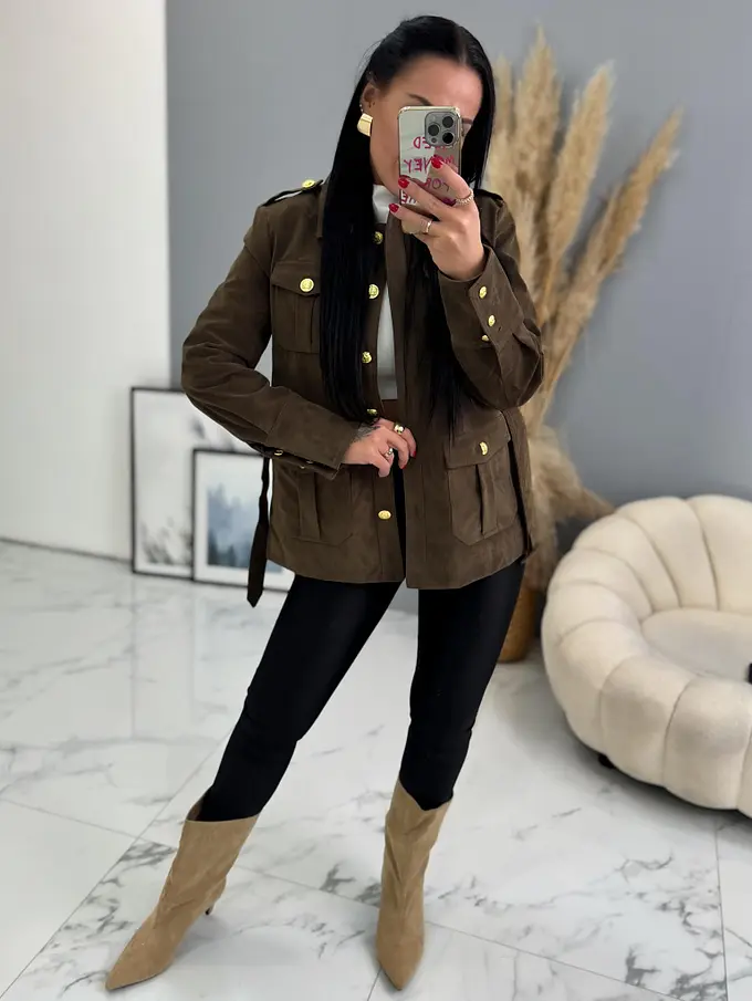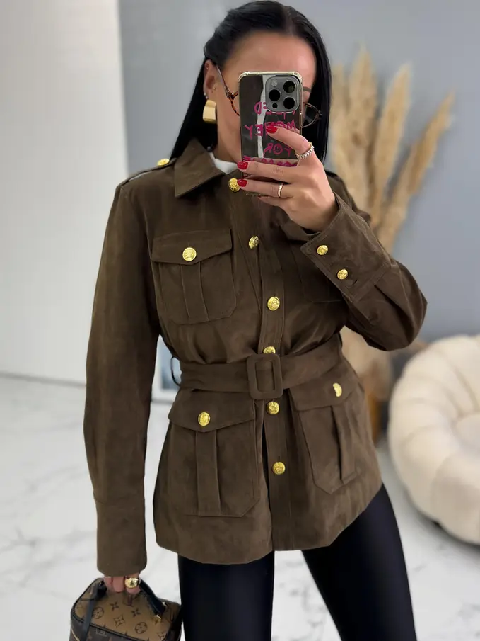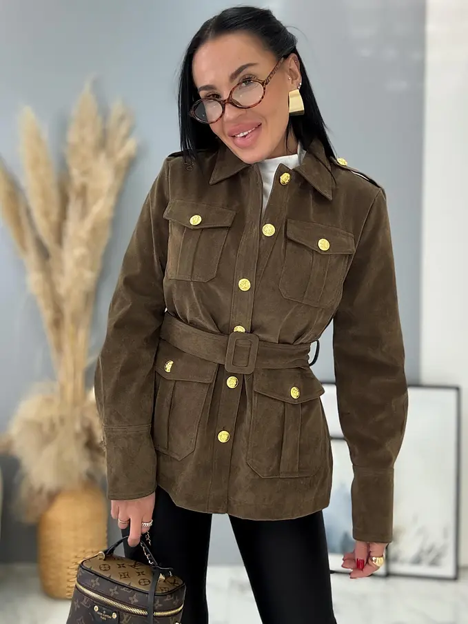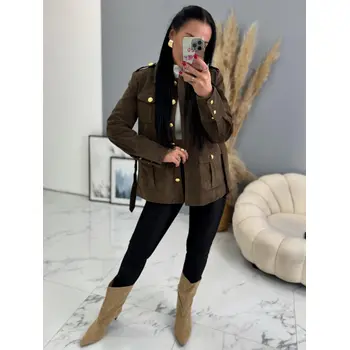 Kellemes anyagból készült. Elején zsebekkel. Övvel és aranyozott gombokkal.