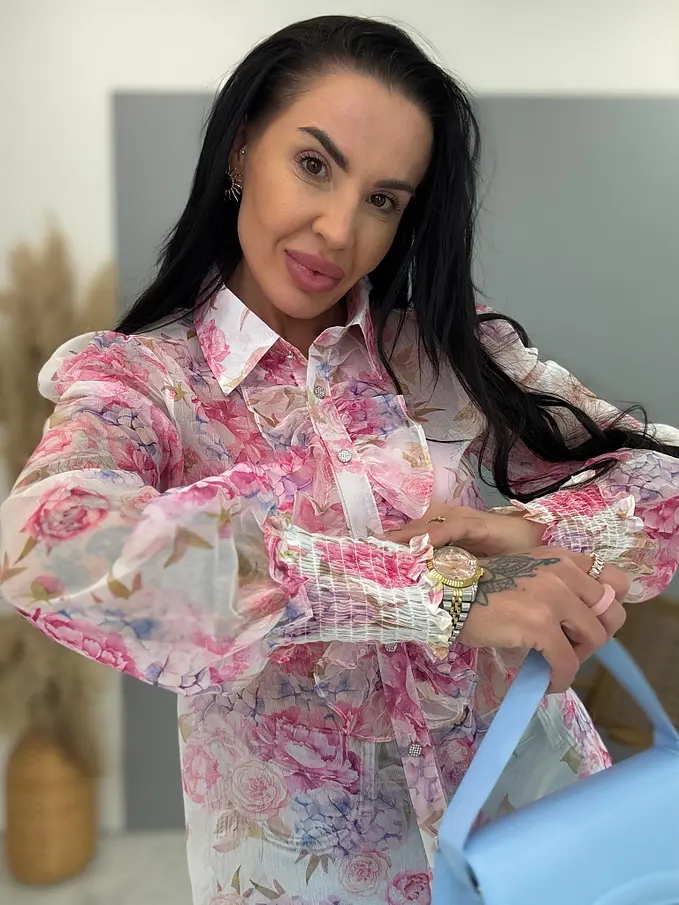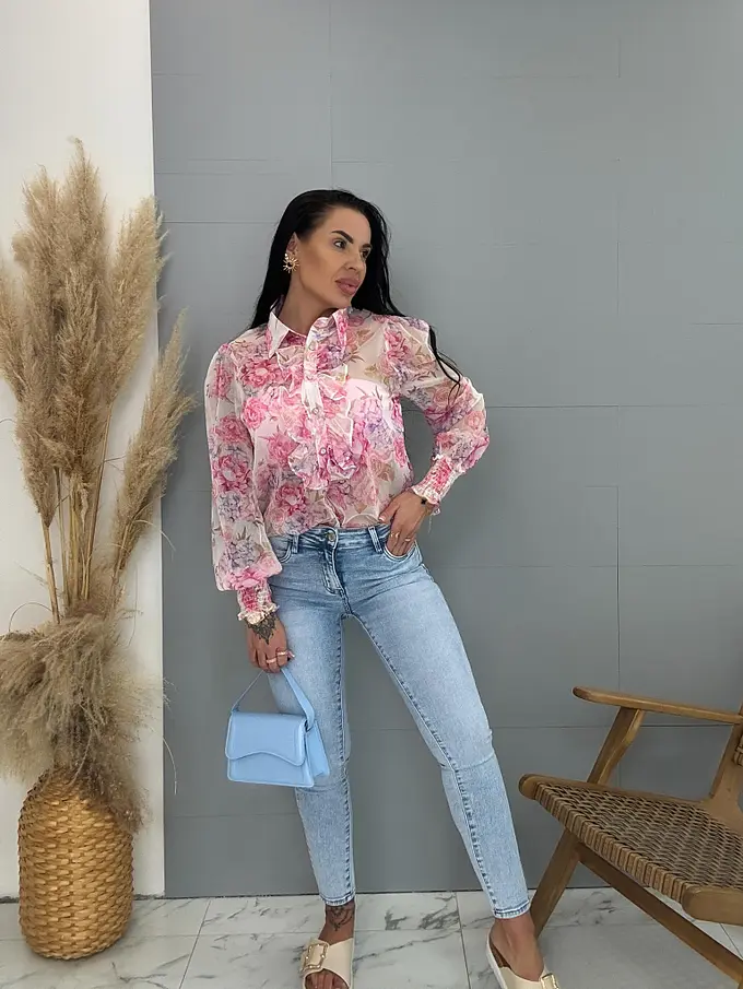 Virágmintás blúz díszes, kövekkel kirakott gombal ROSE