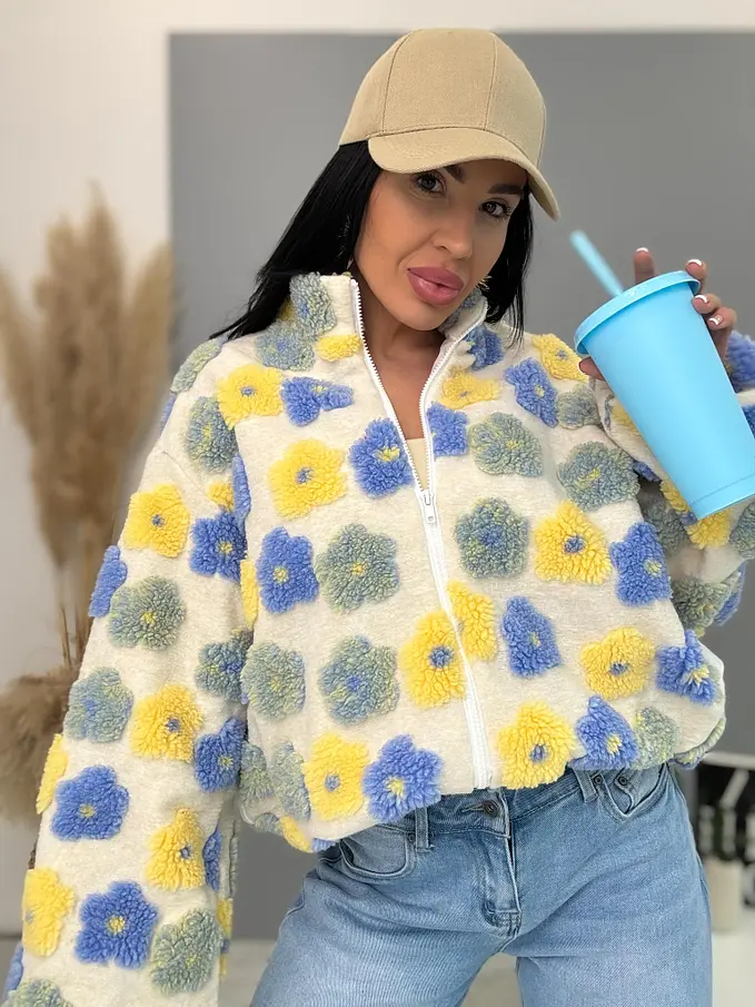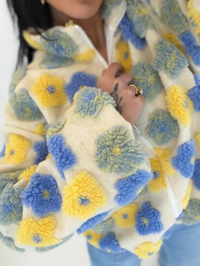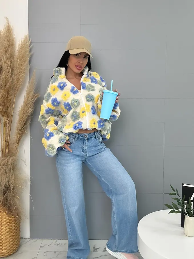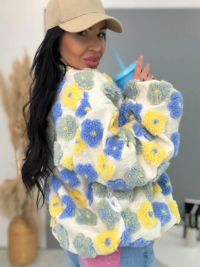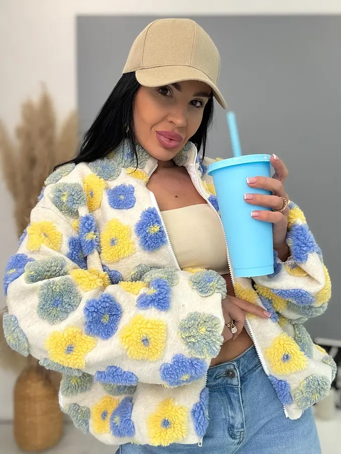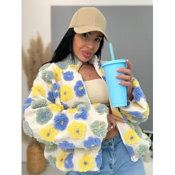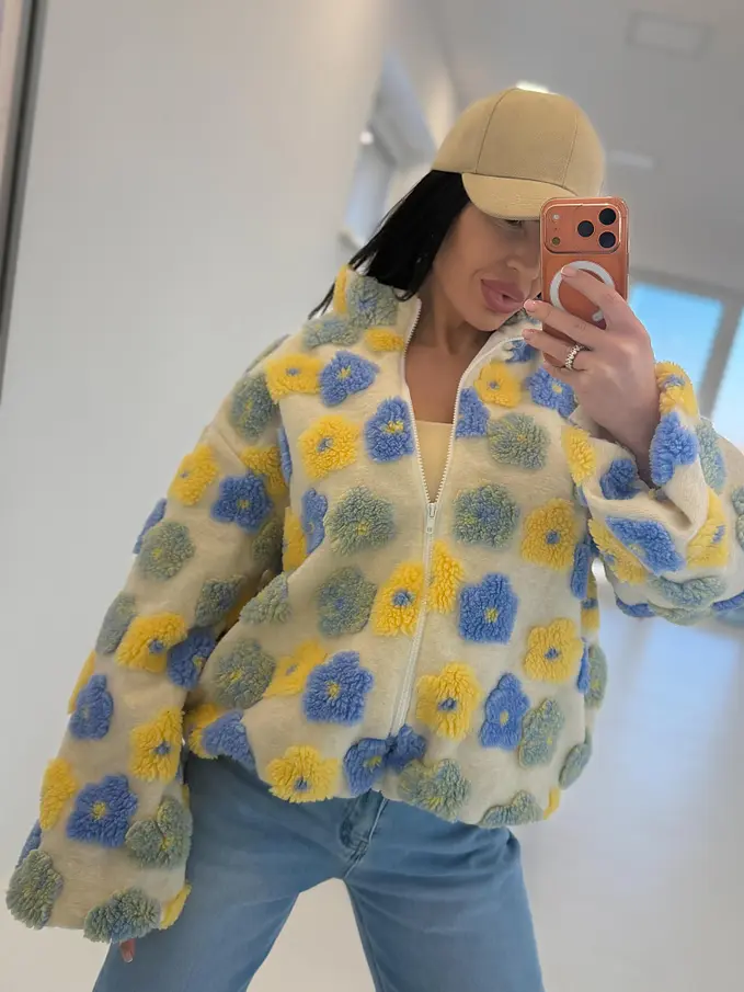A kabát kellemes anyagból készült. A modell kiemelkedik plüss virágapplikációival. Oversize fazon, állónyakrésszel és béléssel. Cipzárral záródik és oldalzsebekkel.