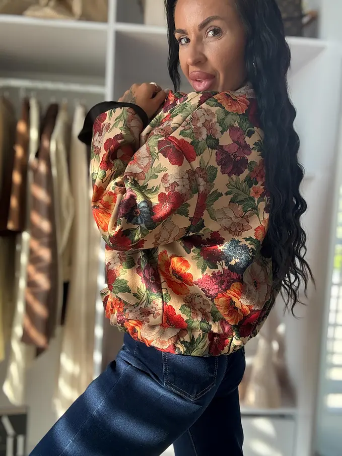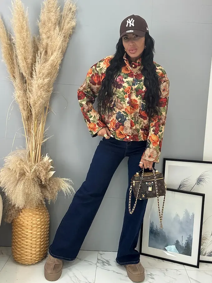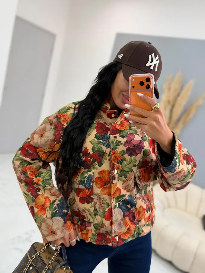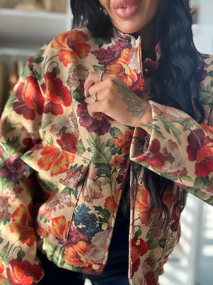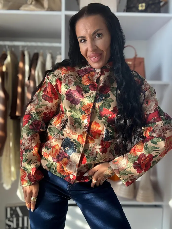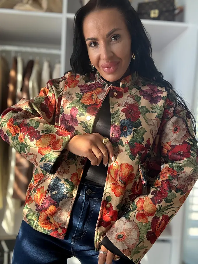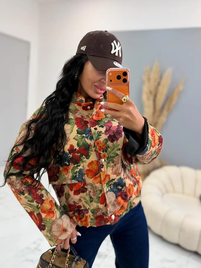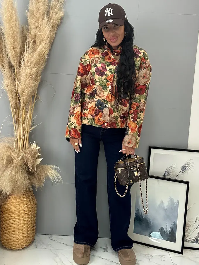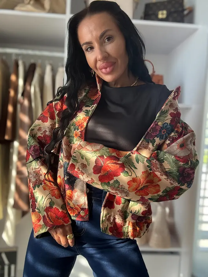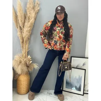 Kellemes anyagból készült. Arany színű kapcsokkal záródik, és két zseb található az elején.