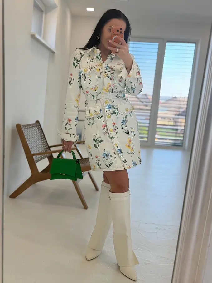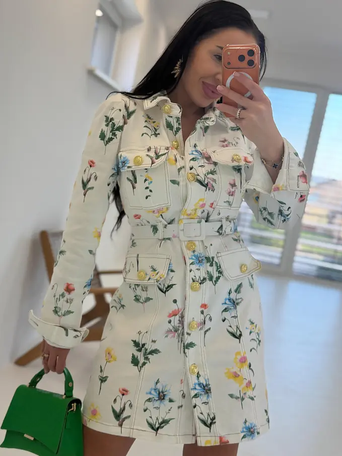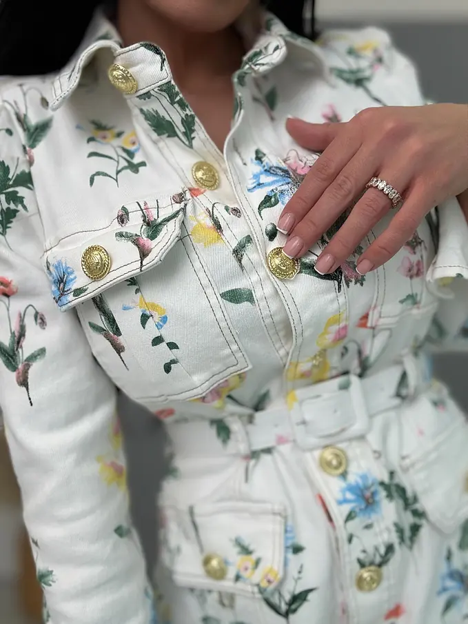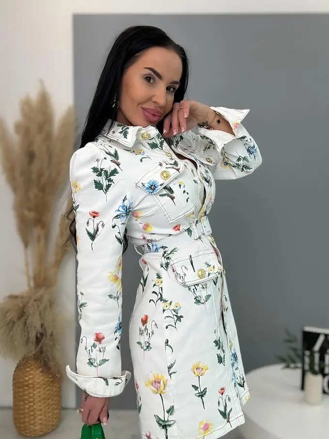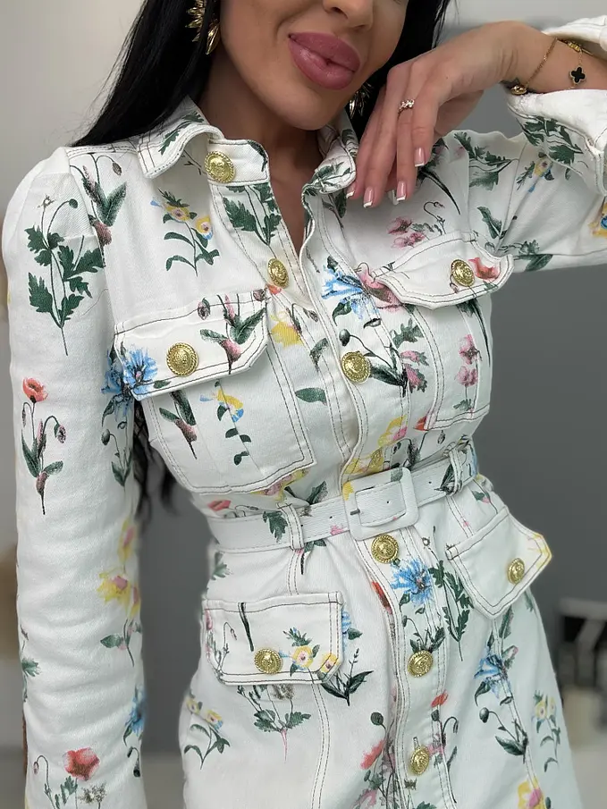 Prémium ruhák közvetlenül Franciaországból. Virágmintás farmerruha arany gombokkal és övvel. Az anyaga elasztikus.