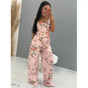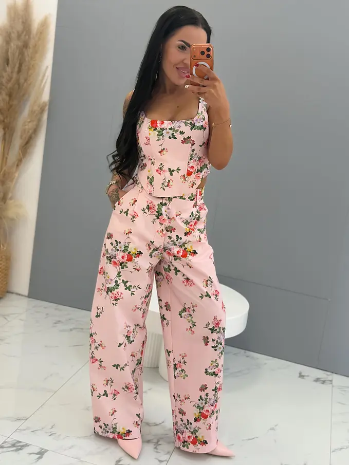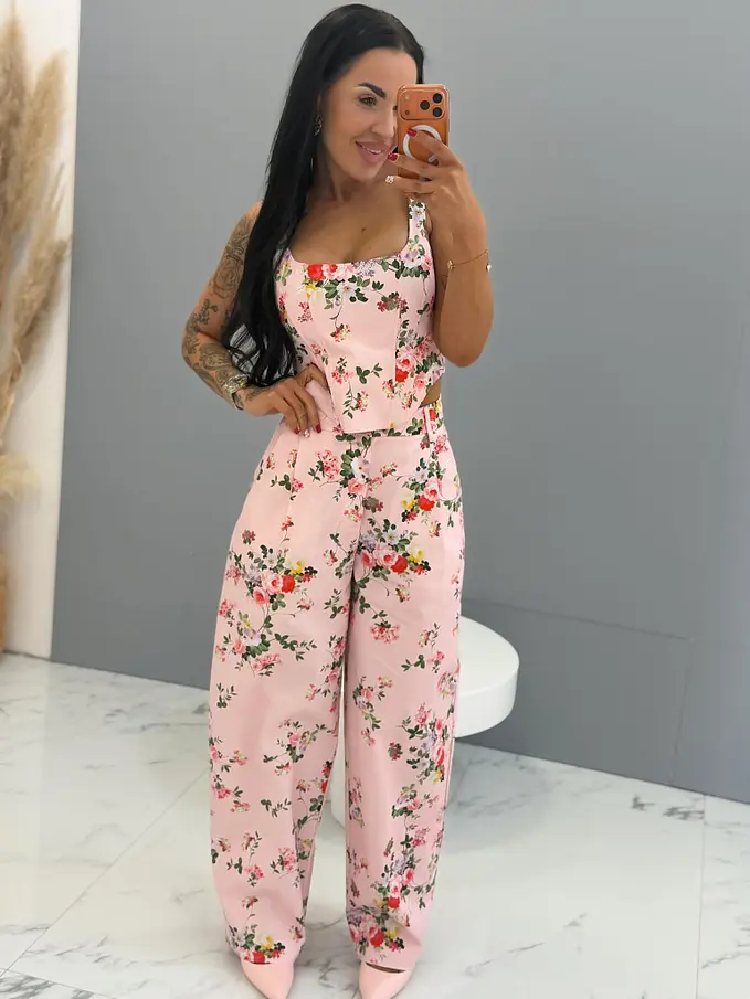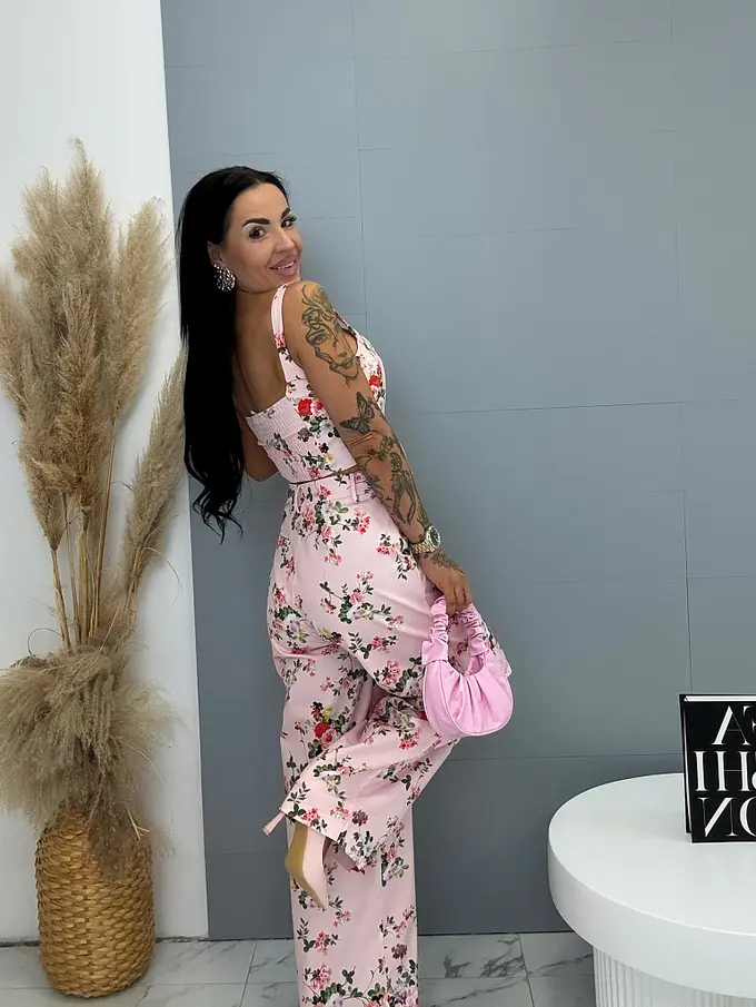 Virágmintás, kétrészes szett az új kollekcióból, közvetlenül Olaszországból. Crop topból és nadrágból áll. Az anyaga kellemes, enyhén rugalmas. A crop top hátul gumírozott betéttel rendelkezik és az oldalán cipzárral.