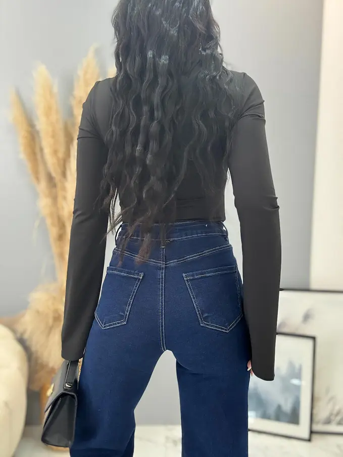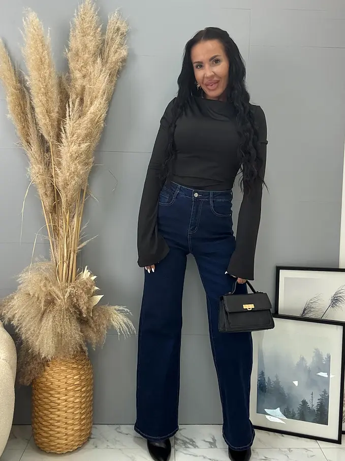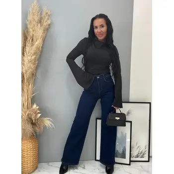 Wide leg farmer, amelyet széles, egyenes szárak jellemeznek. Ez a magas derekú modell enyhén rugalmas anyagból készült.