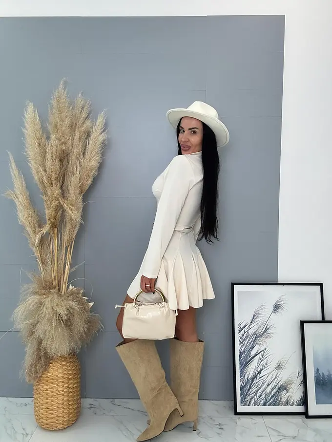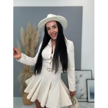 A ruha kellemes anyagból készült. Enyhén elasztikus. Övvell és gombos záródással.